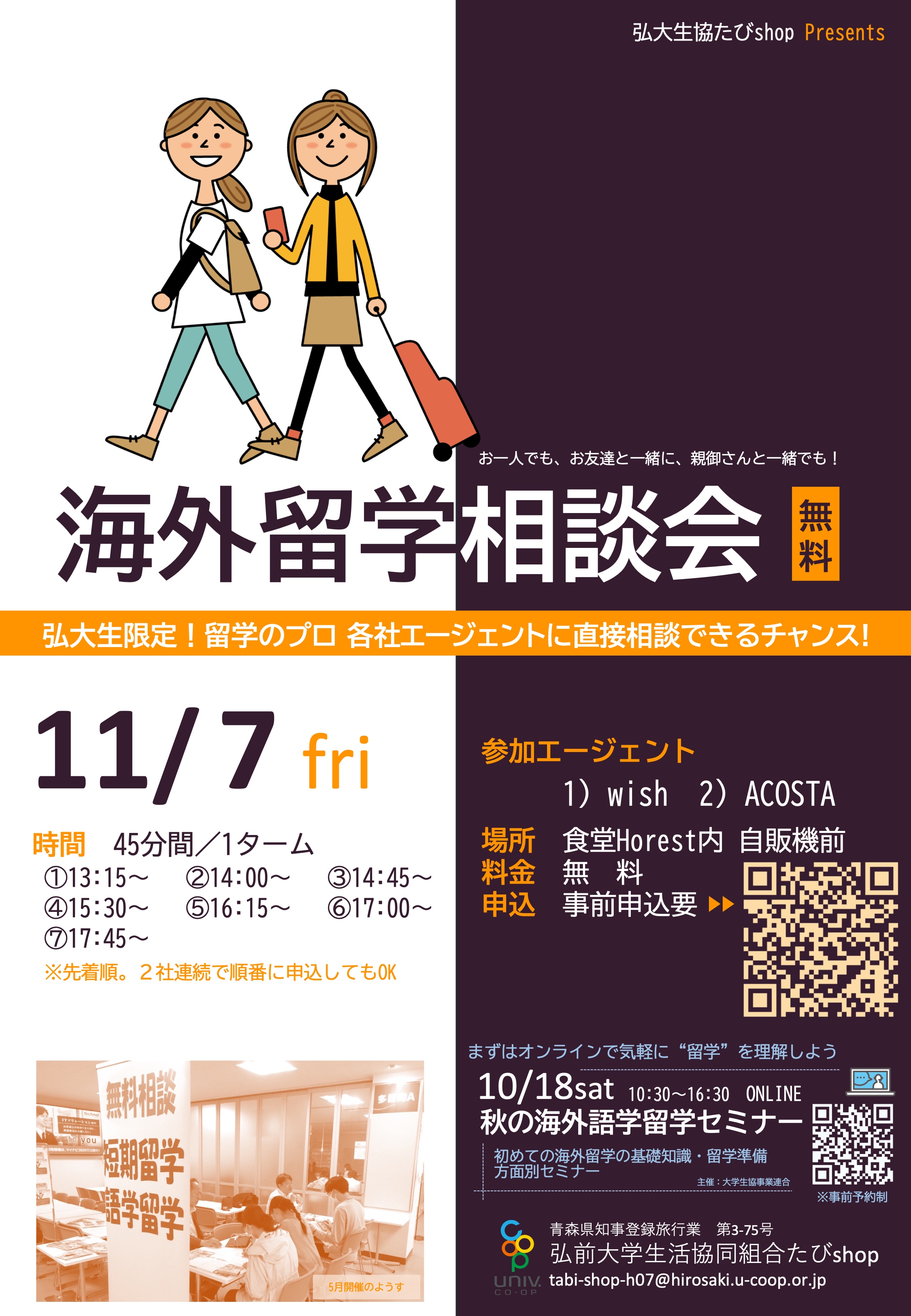 のご要望にお応えし、弘大生協の提携エージェントに直接相談できる海外留学相談会を開催します。